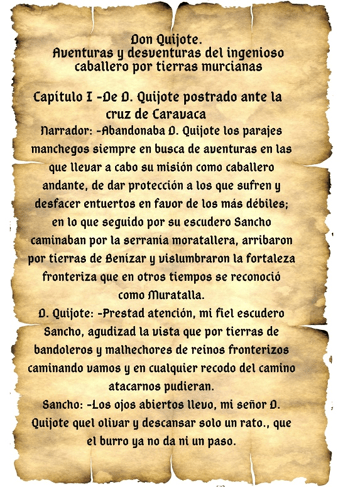 D. Quijote: ¡A Caravaca, marcharemos!, escoltando y dando protección a vuesa excelencia, hasta llegar a ingresar en la muralla protegida por la cruz de Cristo.